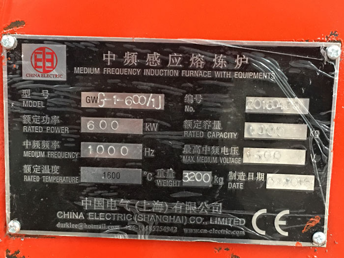 Nameplate for 1 ton 600 kw medium frequency induction furnace