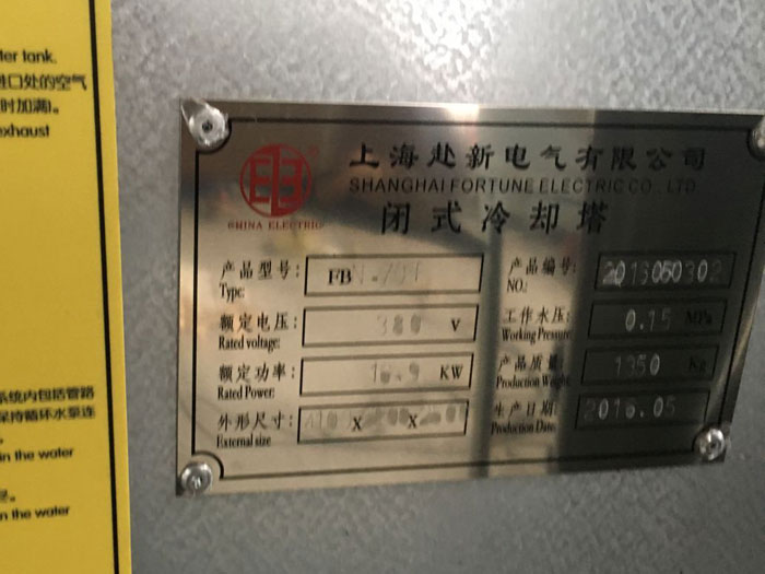 Nameplate for 70 ton/hr closed cycle water cooling tower