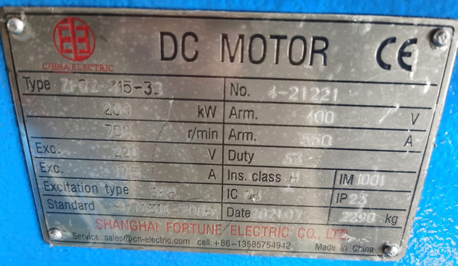 Nameplate for ZFQZ-315-32 200 kW armature 400 V field 220 V 700 rpm duty S3 DC motor for driving cobble shear
