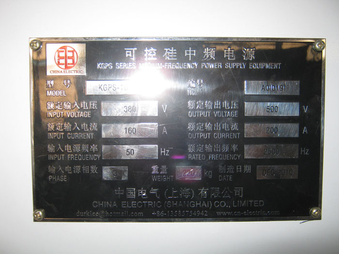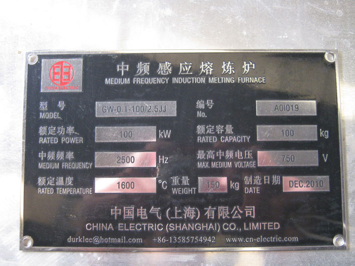 A set of 100kg Medium Frequency Induction Furnace was shipped from Shanghai to Mersin, Turkey on DEC. 30th, 2010. The technical data for this 100kg Induction furnace is as below: Model: GW-0.1-100/2.5JJ Rated capacity: 100kg (0.1 Ton) Rated power: 100kw Working Frequency: 2.5kHz Tilting type: Mechanical tilting by electric motor Power input: 3phase, 380Vac, 50Hz Some pictures for this 100kg induction melting furnace are as below: Nameplate on 100kg Induction Furnace Body