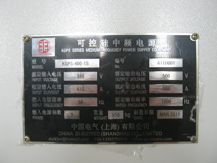 Nameplate for this 750kg 400kw induction melting furnace