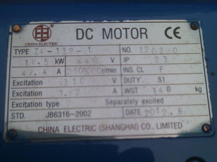 1PC of Z4 Series DC Motors were shipped for Port Kelang, Malaysia on June 21, 2012 Some information about this DC motor is as below: Z4-132-1, 18.5Kw, 2850/3000RPM Armature Voltage: 440Vdc Field Voltage: 310Vdc Cooling: IC06(with cooling fan & filter fix at the commutator end) Fan Power: 3phase,415V,50Hz, Protection: IP23, Insulation class F, Mounting: V6, Duty: S1 Ambient temp. 40oC, Max. Altitude 1000m Winding and bearing with PT100 for thermal protection Using NSK Bearing from Japan