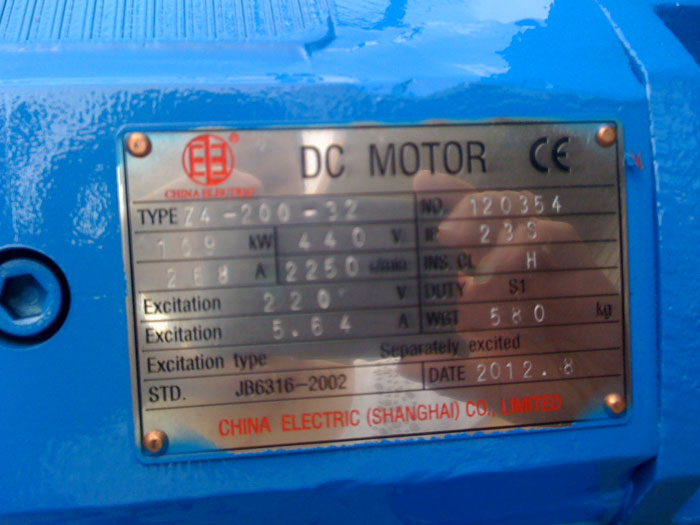 1piece 109Kw DC Motor Z4-200-32 was shipped for Bandar Abbas Iran on Aug 23 2012. Some information about this DC motor is as below: Z4-200-32, 109Kw, Rated Speed 2250RPM Armature Voltage: 440Vdc, Armature Current: 268A Field Voltage: 220Vdc, Field Current: 5.64A Cooling: IC06(with cooling fan & filter fix at the driving end) Fan Power: 3phase,380V,50Hz, Protection: IP23S, Insulation class H, Mounting: B3, Duty: S1 Ambient temp. 40oC, Max. Altitude 1000m Winding and bearing with PT100 for thermal protection NSK Bearing from Japan Tachogenerator ZYS-12A, 270V, 0~4500rpm