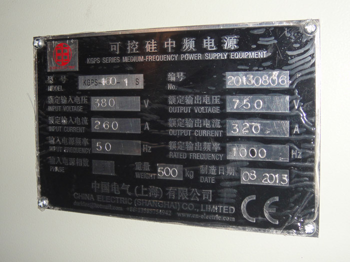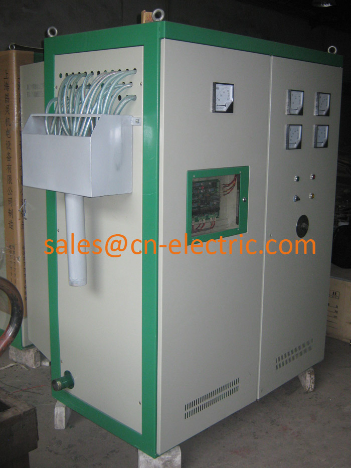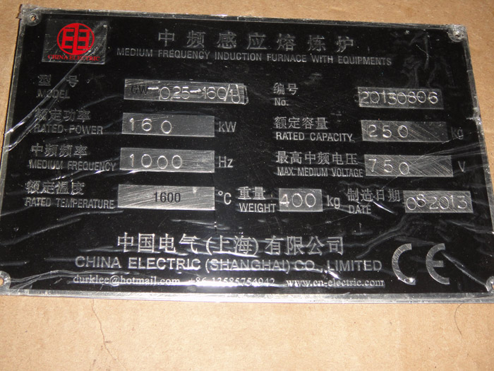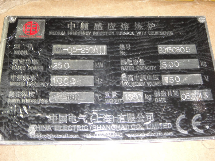 1 set 250kg 160kw and 1 set 500kg 250kw medium frequency induction melting furnaces were shipped for Surabaya Indonesia on Sep. 22, 2013 Model 1: GW-0.25-160/1JJ Model 2: GW-0.5-250/1JJ Type: GW-JJ series aluminum shell mechanical tilting. Power supply: 3phase/380VAC/50Hz 160kw power supply cabinet for 250kg induction furnace
