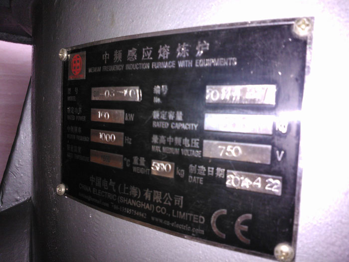 1 set of 0.3 Ton 160 Kw induction furnace with 3pcs of 300kg hot metal ladles were shipped for Pasir Gudang, Malaysia on May 21,2014 Induction Melting Furnace Rated capacity: 0.3 Ton (300 kg) Rated Power: 160 Kw Working Frequency: 1000Hz Model: GW-0.3-160/1JJ Type: Non-magnetic aluminum shell furnace body, mechanical tilting by electric motor with gear box Power Supply: 3phase/415VAC/50Hz 0.3 ton induction furnace body: 2pcs