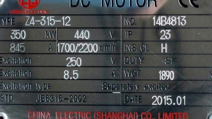1 set 350Kw DC Motor Z4-315-12 was shipped for Singapore on Jan. 17th, 2015 Some information about this DC motor is as below: Model: Z4-315-12, Rated Power: 350 Kw Speed: 1700/2200 RPM, Armature voltage: 440 Vdc