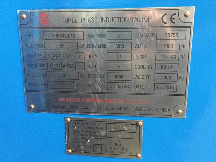 YRKK450-12 150kw 60Hz 3300V High Voltage Wound Rotor Slip Ring Motor was shipped for Incheon, Korea on March 8th, 2015 Technical parameters for this slip ring wound rotor motor: Model: YRKK450-12 Rated power: 150 Kw Frequency: 60 Hz Stator voltage: 3300 VAC Stator current: 41.4 A Connection: Y Rotor voltage: 526 VAC Rotor current: 177 A Connection: Y Rated speed: 591 r/min Insulation class: F Temperature rise B Power factor: 0.7 Duty: S1 continuous Mounting: B3 (IM1001) Cooling type: IC611 Protection rating: IP55 Bearing brand: SKF Service factor: 1.15 With 220 VAC 60 Hz single phase anti-condensation space heater Pictures for YRKK450-12 150Kw high voltage wound rotor slip ring motor