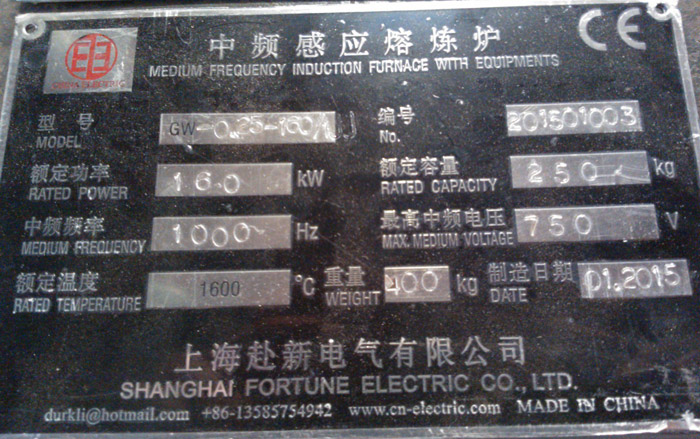 Nameplate of 160 kw 250 kg induction melting furnace