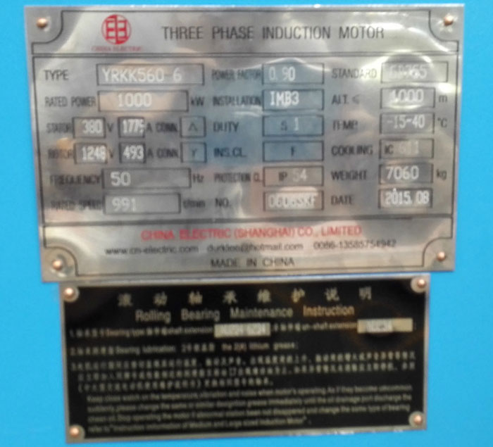 Nameplate for 1000 Kw 380 V YRKK560-6 wound rotor slip ring motor
