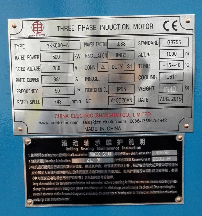 1 pc of YKK500-8 500 KW 380 V 743 r/min medium size squirrel cage motor was shipped for Ho Chi Minh Vietnam on Sep. 4th, 2015. Nameplate