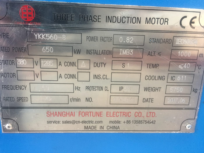 Model: YKK560-8 Rated power: 650 Kw Stator voltage: 380 v Stator current: 1285 A