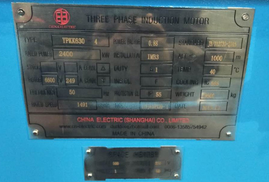 Nameplate of YPKK630-4 2400 kW 6.6 kV IC666 IP55 YPKK Medium Voltage Variable Frequency Inverter Motor