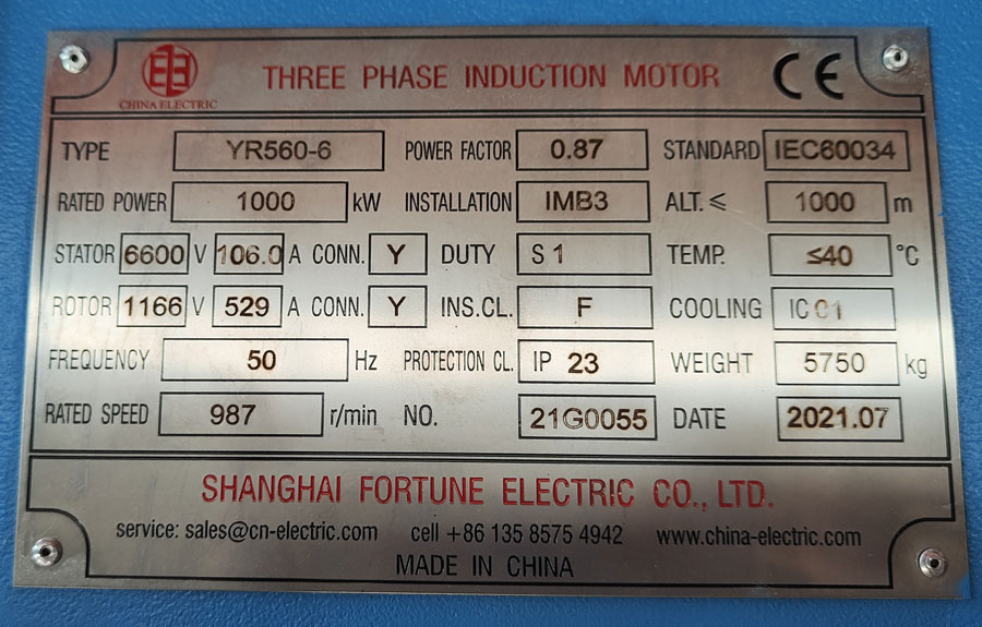 Nameplate for YR560-6 1000 kW 6600 V High Voltage Wound Rotor Slip Ring Motor