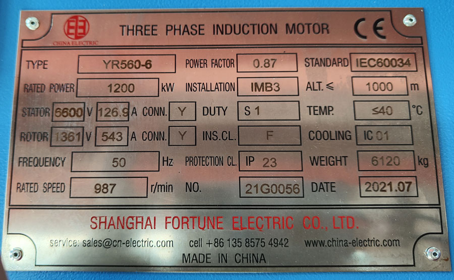 Nameplate for YR560-6 1200 kW 6600 V High Voltage Wound Rotor Slip Ring Motor