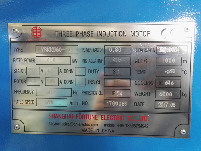 Model: YRKK560-10 Rated power: 450 Kw Stator voltage: 5500 V Stator current: 63 A