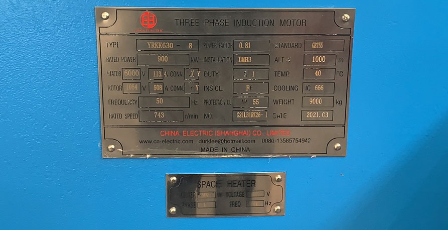 Nameplate for YRKK630-8 900 kW 6000 V High Voltage Wound Rotor Slip Ring Motor