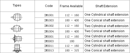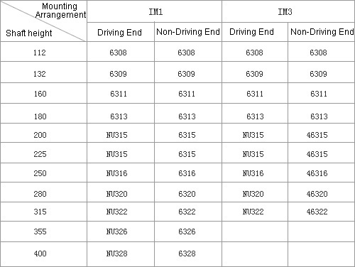 The type of bearing used in these series motors are shown in table 6.