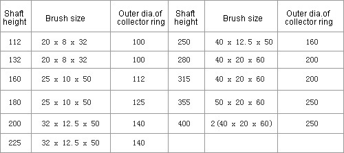 The brush molders of the YZR series motors are provided with spring of constant pressure of the latest design so that the pressure between the collector ring and brush can remain unchanged while the brush are worn out during operaton. The type of brushes used is J201 and size sare shown in table 7.