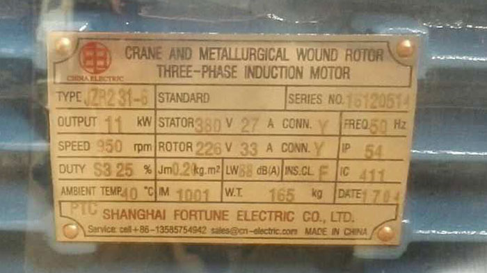 Nameplate for JZR2 31-6 11 kW 950 rpm Crane & Metallurgical Wound Rotor Slip Ring Motor