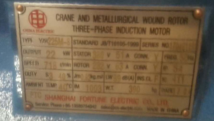 Nameplate for YZR225M-8 22 kW 718 r/min Crane & Metallurgical Wound Rotor Slip Ring Motor