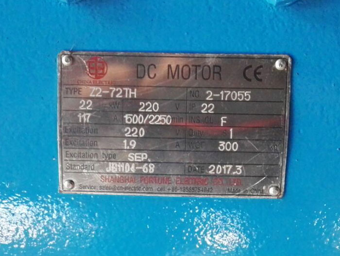 Nameplate for Z2-72TH 22 kW 220 V DC Motor